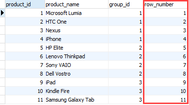 We will use the products table created in the PostgreSQL window function tutorial to demonstrate the functionality of the ROW_NUMBER() function.
